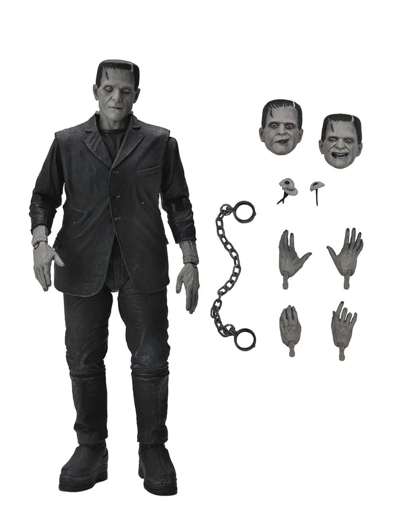From NECA. To celebrate the 90th anniversary of the acclaimed silver-screen classic Frankenstein, NECA announces the triumphant debut of Universal Monsters in its Ultimate action figure line! The sculpt captures Boris Karloff’s poignant portrayal of the misunderstood monster in authentic black-and-white. Standing in 7″ scale, the figure comes in premium anniversary packaging with plenty of accessories: 3 interchangeable heads, 6 interchangeable hands, shackles and daisies.